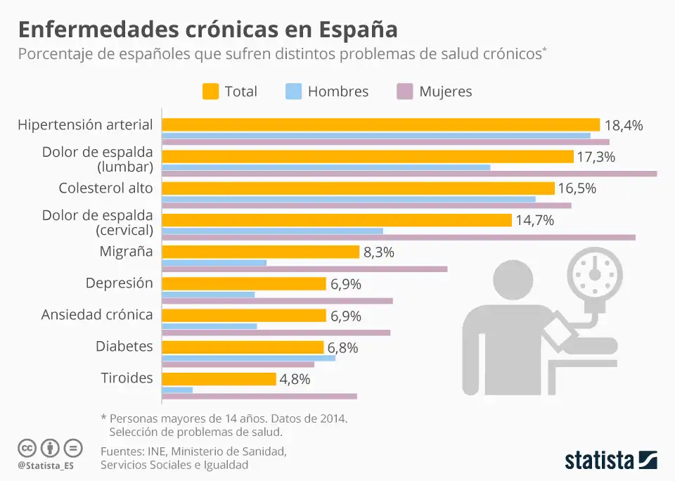 La prevalencia de enfermedades crónicas aumenta con la edad, siendo especialmente preocupante en la población mayor de 65 años. En este grupo, el 40% de los hombres y el 44% de las mujeres padecen dos o más enfermedades crónicas. Este fenómeno no solo afecta la calidad de vida de los individuos, sino que también incrementa la presión sobre los hospitales y centros de salud, lo que a su vez demanda más recursos humanos, económicos y sociales.