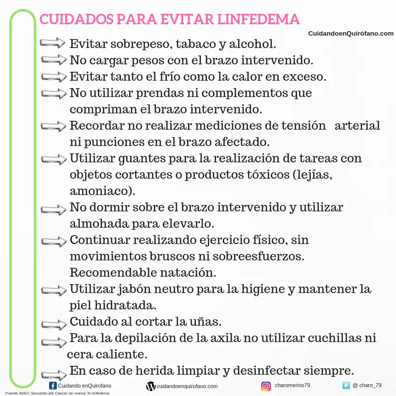 – **Prevención del Linfedema**: En casos donde se han extirpado ganglios linfáticos de la axila, existe el riesgo de desarrollar linfedema, una condición que causa hinchazón en el brazo o la mano del lado afectado. Para prevenirlo, se recomienda evitar lesiones en esa área, usar protector solar y mantener la piel hidratada. Además, es importante informar al personal médico sobre la cirugía para evitar procedimientos invasivos en ese brazo, como extracciones de sangre o inyecciones.